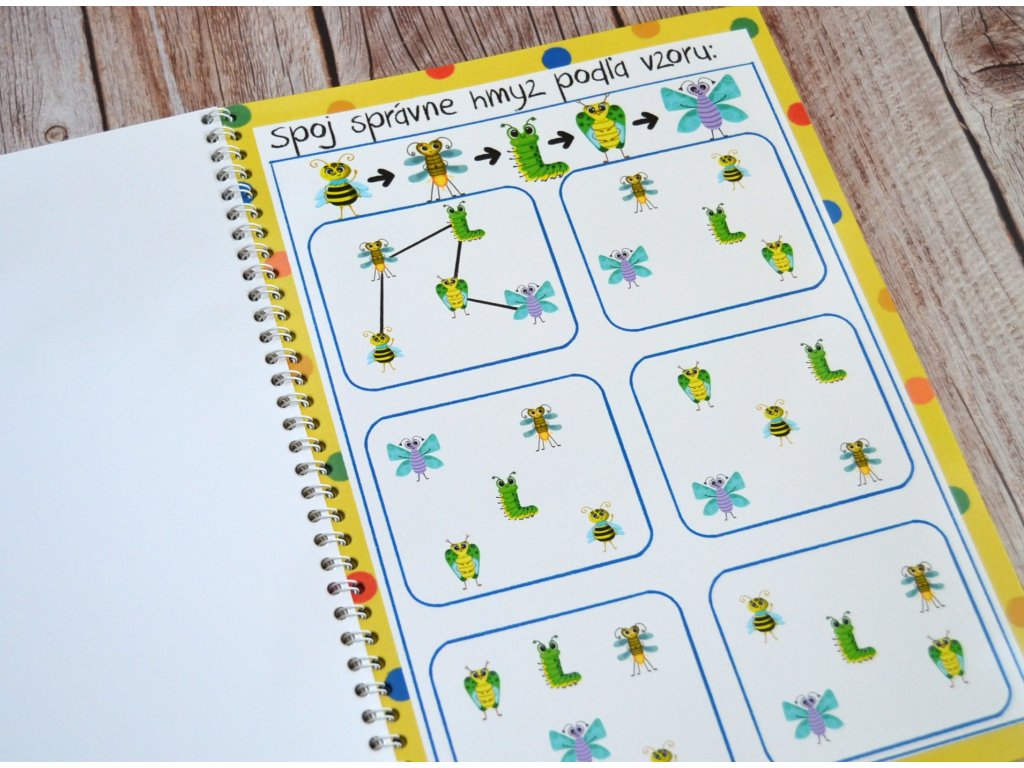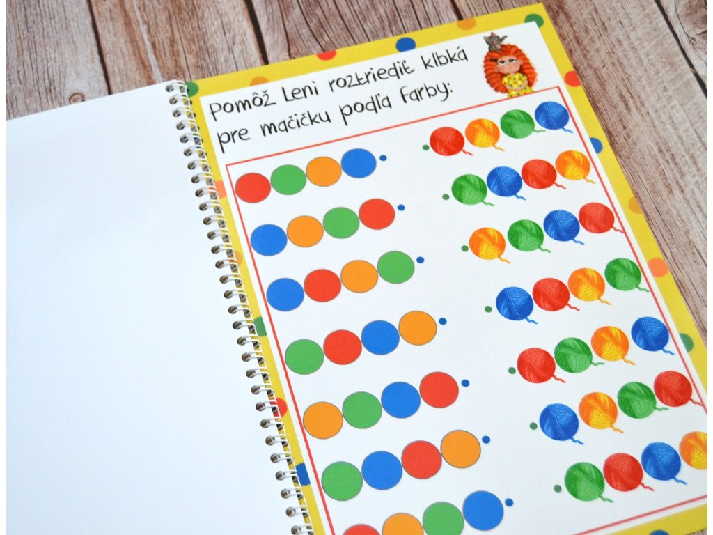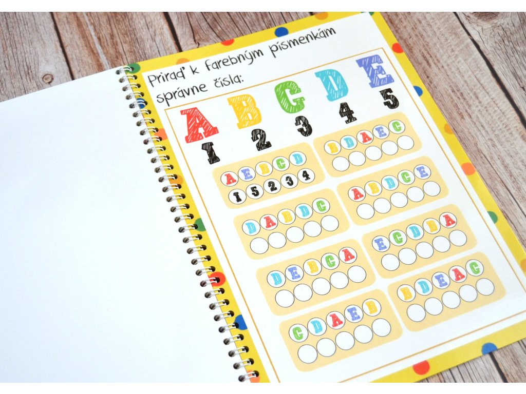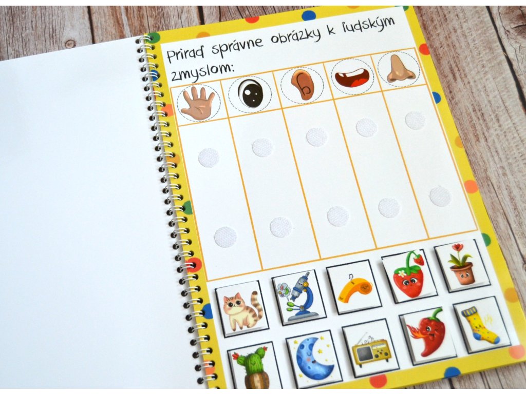 - obsahuje 10 strán s interaktívnymi úlohami na suchý zips a zmazateľná 4 farebné fixky, ktorá sú súčasťou zošita